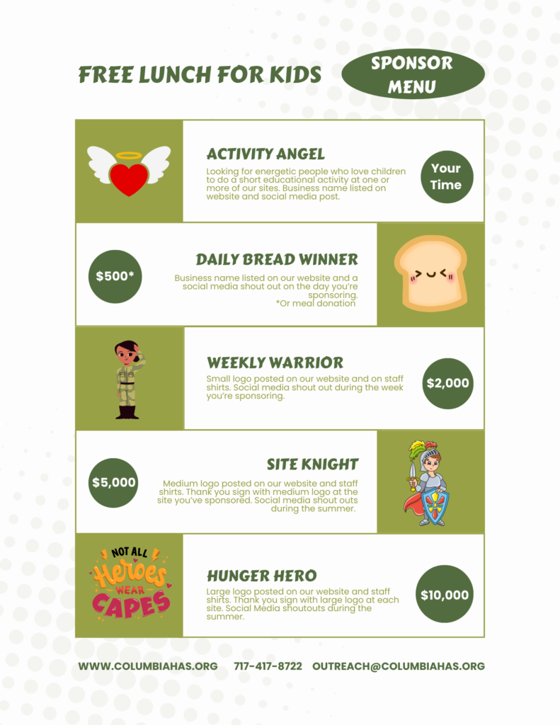 We’re looking for local churches and businesses to partner with us to feed the kids of Columbia this summer! You can donate money, a meal, or your time. Please contact Jenn at outreach@columbiahas.org for more information.